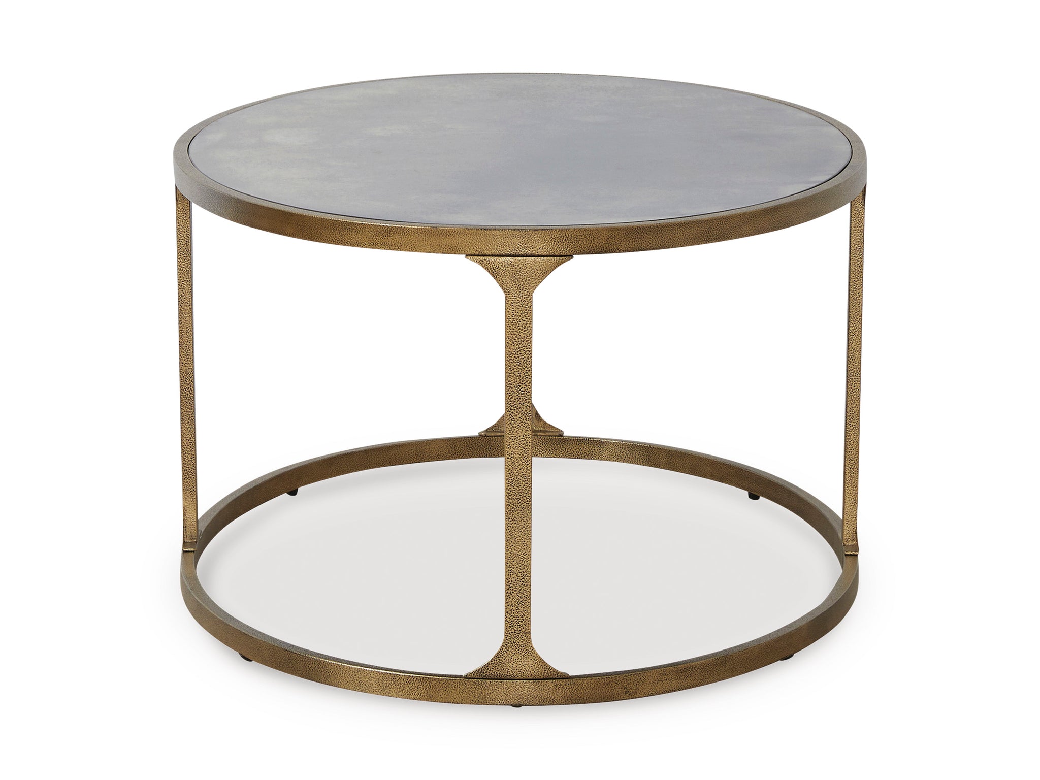This coffee table blends a traditional feel with contemporary design cues. Antiqued gold texturing on the frame has the look of timeworn, hand-forged metal. A tempered glass top with a...