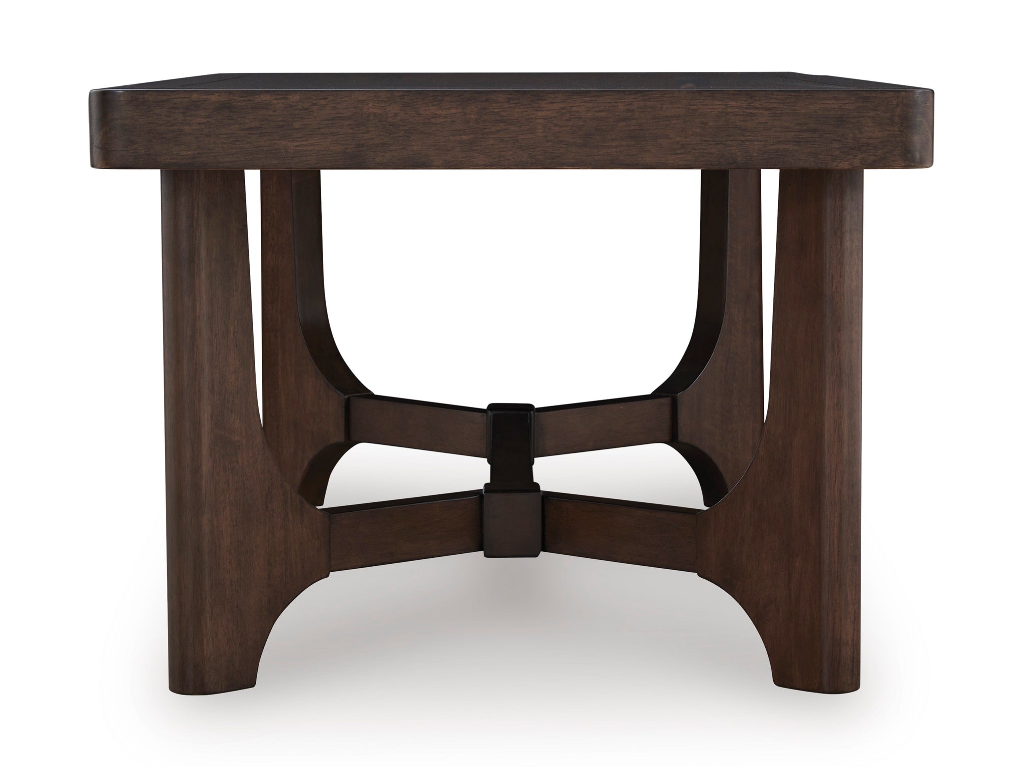 Master the art of casual contemporary design with this coffee table. Its softly rounded wood frame top pairs perfectly with an eye-catching double wishbone base and a rich brown finish...